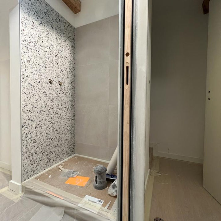 Le challenge de cette rénovation ? Réunir deux appartements pour n'en faire qu'un seul sur 3 niveaux. Pour cela, il nous a fallu ouvrir une trémie dans le plancher commun, afin de permettre l'installation d'un escalier sur-mesure. Une des portes palières a été condamnée (avec un système démontable, pour permettre de revenir en arrière si nécessaire).